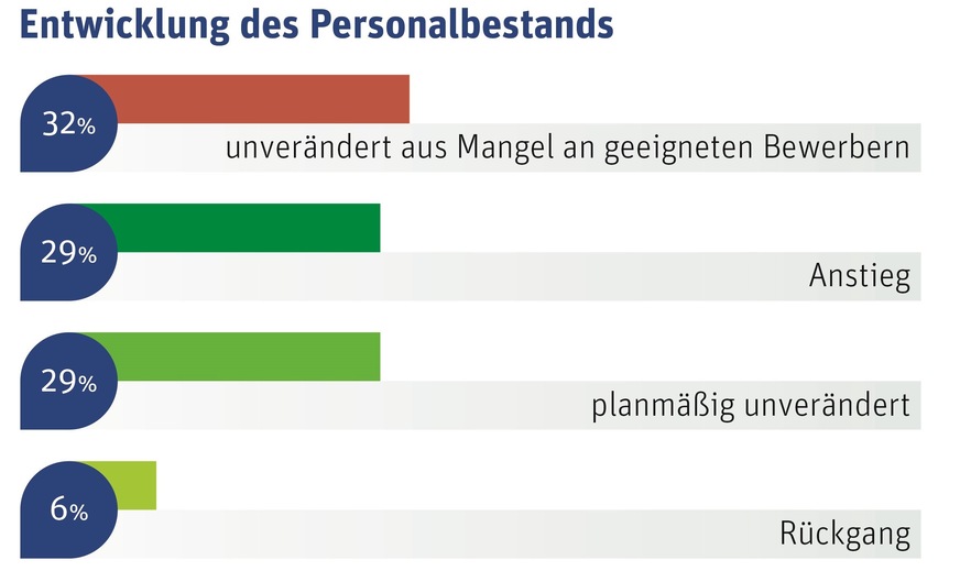 „Allerdings entwickelt sich die immer häufiger vergebliche Suche nach qualifizierten Fachkräften mehr und mehr zur Wachstumsbremse für unsere Unternehmen“, kommentiert VBI-Präsident Jörg Thiele die Umfrageergebnisse. Drei Viertel der Umfrageteilnehmer beklagen die zunehmend schwierigere und langwierigere Suche nach qualifiziertem Personal. Ein Drittel der Unternehmen (32 %) musste aus Mangel an geeigneten Bewerbern 2019 ohne die geplanten Neueinstellungen auskommen.