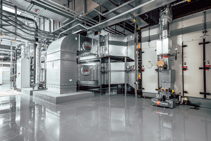Für die Produktion neuer Arzneimittel braucht es aber nicht nur die Expertise der Spezialisten von Boehringer Ingelheim und intelligent arbeitende Maschinen, sondern auch ein hygienisch reines Produktionsumfeld. Sechs Lüftungsgeräte (Zu- und Abluft) der BerlinerLuft. Technik GmbH sorgen für partikelarme Luft in den Produktionsräumen der smarten Tablettenfabrik. Sie arbeiten mit einem Gesamtvolumenstrom von 324 000 m3/h. Zwei Zuluftanlagen mit je 67 500 m3/h Gesamtvolumenstrom liefern partikelarme Luft für den Reinraum. Eine kleinere Zuluftanlage mit 30 000 m3/h Gesamtvolumenstrom versorgt den unklassifizierten Bereich außerhalb des Reinraums, wie Büroräume oder Flur.