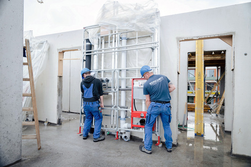 Sprung auf die Baustelle: Mithilfe des Krans werden die vorgefertigten Wände als gesamtes Paket mit den Abladehilfen auf das vorgesehene Stockwerk gezogen. „Für uns ist die Erleichterung schon immens. Allein, weil für uns der umfangreiche Transport von Rohren und Material auf die Etagen entfällt. Außerdem wissen wir bereits vorab, welche Werkzeuge wir auf der Etage benötigen“, erklärt Monteur Björn Vallentin von der Firma Kerkhoff. Auf der Etage selbst übernehmen zwei Handwerker. Sie verteilen die Elemente auf der Etage, bringen sie per Kran an ihre jeweiligen Bestimmungsorte. Fixieren sie am Boden und an der Wand und richten sie nach den gegebenen Höhen aus. Danach werden die Leitungen in die darüberliegende Etage verlängert.