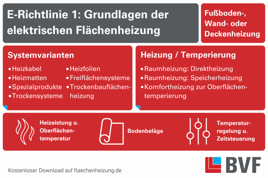 Die Elektro-Richtlinie beschreibt detailliert die unterschiedlichen Varianten elektrischer Flächenheizungen, darunter unter anderem Heizkabel, Heizmatten und Heizfolien. Die Systeme eignen sich für die Verlegung in Böden, Wänden und Decken. Neben der innenarchitektonischen Gestaltungsfreiheit ermöglichen die Systeme aufgrund der zahlreichen Ausführungsarten auch bei individuellen Nutzerwünschen die jeweils optimale Lösung.