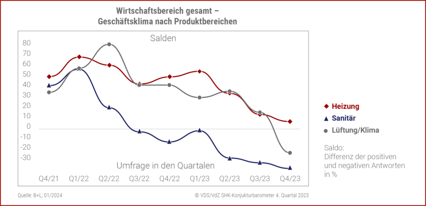 Die Nachfrage in den einzelnen Produktsegmenten ist sehr unterschiedlich. In allen drei Bereichen ist das Geschäftsklima im 4. Quartal 2023 im Vergleich zum Vorquartal gesunken. Das Geschäftsklima im Bereich Lüftung / Klima liegt bei − 23 und im Bereich Sanitär bei − 37. Der Bereich Heizung liegt mit + 7 im positiven Bereich.
