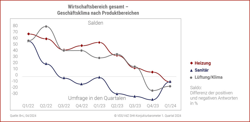 Seit dem 1. Quartal 2024 liegt erstmals auch der Heizungsbereich im Minus. Zwar liegen derzeit alle Produktbereiche im negativen Bereich, in den Segmenten Sanitär und Lüftung / Klima zeichnet sich jedoch eine Verbesserung ab. Der Bereich Lüftung / Klima wird mit einem Wert von − 20 negativer bewertet als die Bereiche Sanitär (Geschäftsklima: − 10) und Heizung (Geschäftsklima: − 11).