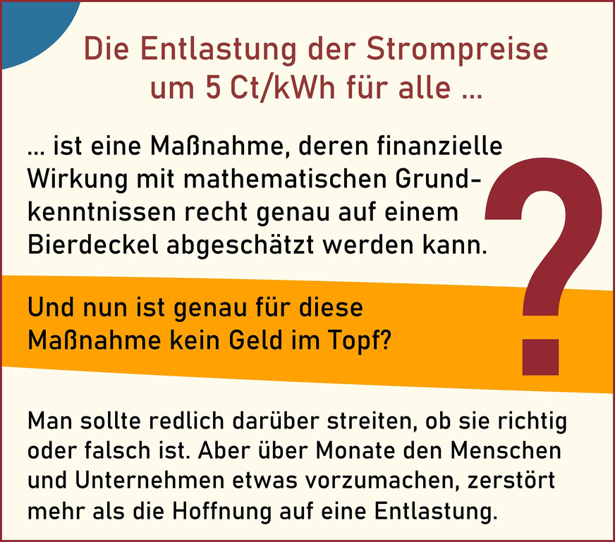 Wir sollten redlich darüber streiten, ob die Maßnahme richtig oder falsch ist. Aber über Monate den Menschen und Unternehmen etwas vorzumachen und sich für die nun infrage gestellte Entlastung feiern zu lassen, zerstört mehr als die Hoffnung auf eine Entlastung. Das gilt auch, wenn der Bundestag die bisherigen Beschlüsse im Bundeskabinett und danach im Koalitionsausschuss noch abändert. ■ Jochen Vorländer