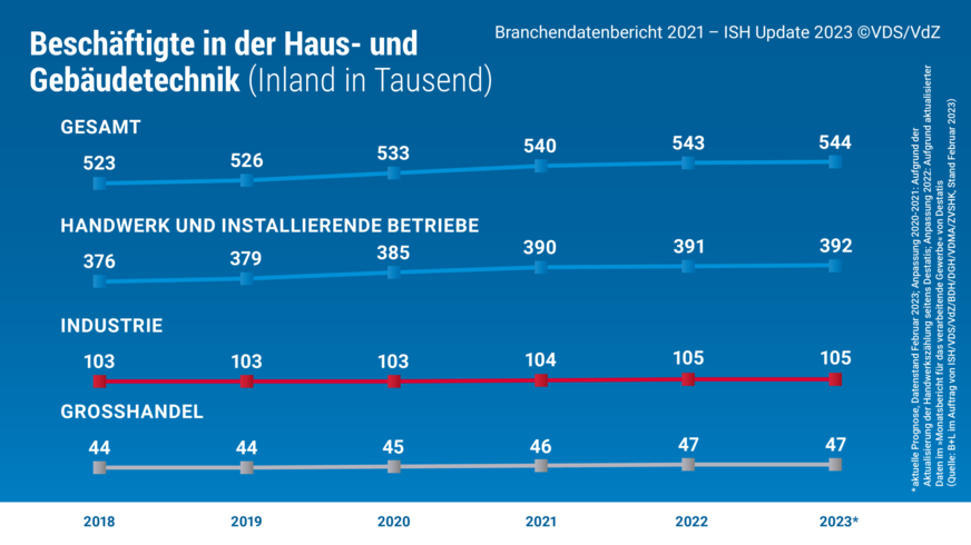 Im Jahr 2022 lagen die Bauinvestitionen im Hochbau bei 308,6 Mrd. Euro in Deutschland. Auf den Wirtschaftsbereich Haus- und Gebäudetechnik entfällt mit 61,3 Mrd. Euro Inlandsumsatz ein Anteil von 19,9 % am Hochbauvolumen. Die Haus- und Gebäudetechnik gewinnt immer stärker an Bedeutung. Im Jahr 2022 ließen sich der Branche 49.800 Unternehmen zuordnen. Die Beschäftigtenzahl im Wirtschaftsbereich lag 2022 bei 543.000. Damit hat sich die Beschäftigtenzahl im Wirtschaftsbereich erneut erhöht, während sich die Unternehmensanzahl leicht rückläufig entwickelte. Die weltweiten Umsätze im Gesamtmarkt der Haus- und Gebäudetechnik beliefen sich 2022 auf 74,3 Mrd. Euro (Inland: 61,3; Ausland: 13 Mrd. Euro). Der Megatrend Klimaschutz und die Nachfrage nach komplexer Gebäudetechnik beflügeln den Wirtschaftsbereich.