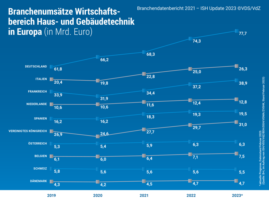 Für 2023 werden steigende Umsätze in Höhe von 77,7 Mrd. Euro (+4,5 %) erwartet. Allerdings wird das Umsatzwachstum in 2023 voraussichtlich schwächer ausfallen als im Jahr 2022. Die Gründe dafür liegen insbesondere in der konjunkturellen Abkühlung im Neubau von Ein- und Zweifamilienhäusern. Auch der Aufschub von nicht zwingend notwendigen Sanierungen im Bad führt zu einer schwächeren Nachfrage. Gestiegene Preise für Baumaterialien und Zinsanstiege drosseln die Neubauvorhaben merklich. Gleiches gilt für Investorenprojekte im Inland.