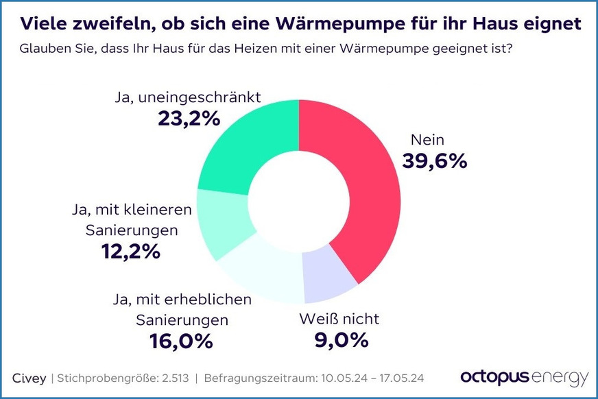 Ebenfalls problematisch für den flächendeckenden Umstieg auf Wärmepumpen: 40 % der Hausbesitzer glauben nicht, dass eine Wärmepumpe für ihr Haus geeignet ist.