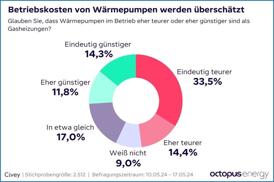 Auch bei den Betriebskosten gingen die Schätzungen auseinander. Knapp die Hälfte aller Befragten (47,9 %) ist überzeugt, dass eine Wärmepumpe im Betrieb teurer ist als eine Gas-Heizung. Die Frage, ob die Hausbesitzer ihr eigenes Haus für geeignet für eine Wärmepumpe halten, beantwortete die Mehrheit (51,4 %) mit ja, allerdings teilweise nur mit Sanierungsarbeiten (12,2 % mit kleinen Sanierungen, 16 % mit größeren Sanierungen).