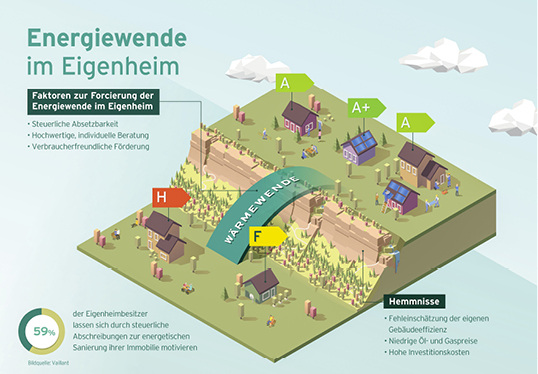 79 % der Verbraucher finden Klimaschutz generell wichtig, 68 % wollen einen persönlichen Beitrag zur Energiewende leisten und 56 % wünschen sich mehr Informationen zu Förderprogrammen und Energiesparmöglichkeiten. Das sind drei Ergebnisse aus einer Befragung, die Vaillant zusammen mit der Deutschen Umwelthilfe (DUH) durchgeführt hat. Die ca. 1000 im Februar 2017 befragten Eigenheimbesitzer im Alter zwischen 25 und 75 Jahren zeigten sich dabei gut informiert und schätzten die große Bedeutung ihres eigenen Verbrauchsverhaltens als Beitrag zum Klimaschutz weitgehend richtig ein. An der Umsetzung mangelt es jedoch: Durchschnittlich wird pro Jahr nur 1 % der Gebäude energetisch saniert – trotz aller Gesetze, Verordnungen und Fördermaßnahmen, die durch die Politik sowohl in der EU als auch in Deutschland auf den Weg gebracht wurden. Die Wärmewende kommt nicht voran. Erst mit einer Verdopplung der Sanierungsquote im Gebäudebereich auf 2 % sind die Klimaziele noch erreichbar. Immerhin: 36 % der Befragten sehen im Tausch der Heizung und einer Änderung ihres Heizverhaltens den größten Hebel für den Klimaschutz. Erst danach folgen mit 16 % die Mobilität und mit 15 % der Stromverbrauch. 48 % wollen in den kommenden zwei Jahren Maßnahmen zur Steigerung der Energieeffizienz an ihrem Gebäude durchführen lassen. 46 % planen hingegen keine Sanierungsaktivitäten. Davon halten 39 % ihr Gebäude für ausreichend effizient – in der Realität sind jedoch 75 % der Gebäude im Bestand unzureichend effizient, wie Statistiken der Bundesregierung belegen. Für 30 % der Befragten sind die geringen Energiekosten der Grund für die Zurückhaltung bei der energetischen Sanierung ihrer Immobilie. Auf die Frage, wie sich der Sanierungsstau auflösen lässt, gaben die Befragten eine deutliche Antwort: 59 % der Hausbesitzer würden Maßnahmen zur Heizkostensenkung ergreifen, wenn diese steuerlich absetzbar wären. Eine Klimaabgabe auf Öl und Gas würde von 44 % akzeptiert – aber insbesondere dann, wenn diese durch gezielte Förderprogramme wieder an die Eigenheimsanierer zurückfließt. Eine allgemeine Klimaabgabe ohne spezifischen Verwendungszweck wird hingegen kritisch gesehen und von weniger als 30 % der Befragten befürwortet. www.vaillant.de www.duh.de