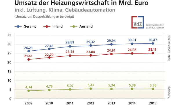 Nach Schätzungen des Münchener ifo Instituts zur konjunkturellen Entwicklung der Heizungswirtschaft ist 2015 der um Doppelzählungen bereinigte Umsatz der Branche (Hersteller von Heizkesseln, Brennern, Heizkörpern, Heizungspumpen, Regeltechnik und Armaturen, Lüftung, Klima, Gebäudeautomation; Großhandel und Installierende Unternehmen) gegenüber den Vorjahren leicht gestiegen. Laut einer Meldung der VdZ hat die Heizungs- und Lüftungs/Klimabranche in Deutschland 2015 einen Umsatz von 30,47 Mrd. Euro erwirtschaftet. Dies entspricht einem Plus von 0,5 % gegenüber dem Vorjahr. Treibende Kraft war dabei die stabile Entwicklung der Inlandsnachfrage. Hier stieg der Umsatz um 0,8 % und belief sich damit auf 25,11 Mrd. Euro. Für das Auslandsgeschäft schätzt das ifo Institut einen Rückgang von 0,6 % auf 5,36 Mrd. Euro. Die gesamte Haus- und Gebäudetechnikbranche profitierte 2015 von dem weiterhin positiven Wirtschaftswachstum und der stabilen Baukonjunktur in Deutschland. Im Installierenden Gewerbe stieg der Umsatz um 0,4 % auf 23,2 Mrd. Euro. Die Umsätze des Großhandels stiegen um 1,1 % auf 9,5 Mrd. Euro. In der Industrie wirkten sich die stabilen Ausgaben für den Wohnungsbau positiv aus. Dieser Branchenbereich erwirtschaftete 2015 Erlöse in Höhe von 13 Mrd. Euro, ein deutliches Plus von 8,3 % im Vergleich zum Vorjahr. Für 2016 erwartet das ifo Institut positive Impulse für die Heizungswirtschaft durch private Konsumausgaben sowie durch einen kräftigen Anstieg der realen Bauinvestitionen. www.vdzev.de