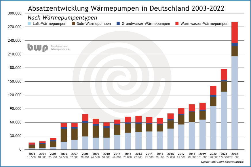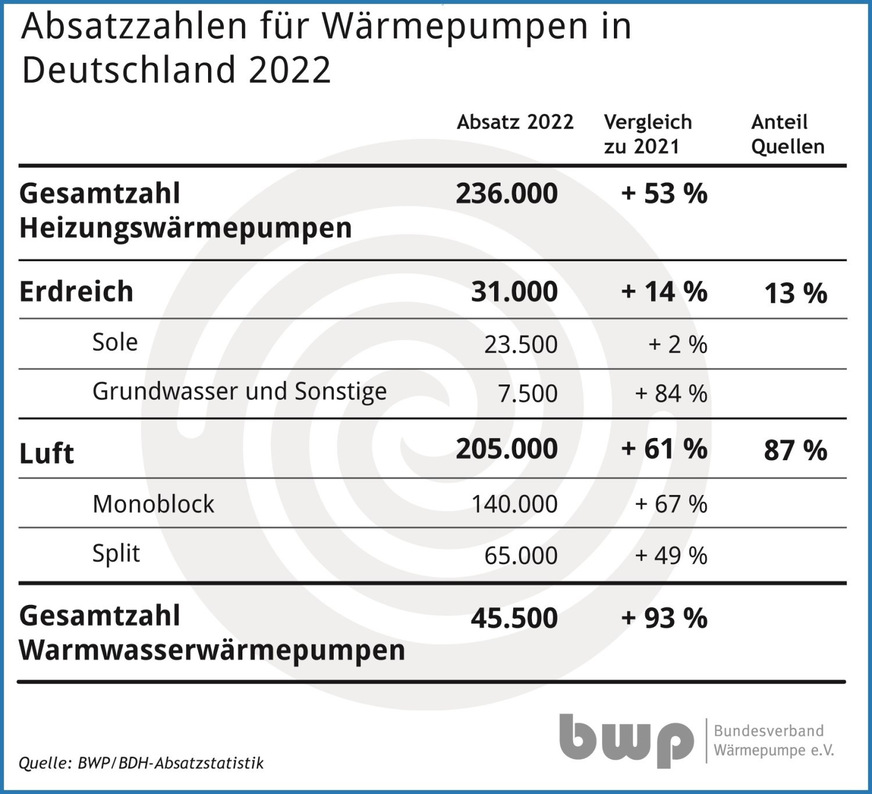 Im Jahr 2022 sind 82 000 mehr Heizungs-Wärmepumpen als im Vorjahr abgesetzt worden: Mit 236 000 Geräten stieg im Jahr 2022 laut der gemeinsamen Statistik von BWP und BDH stieg der Absatz damit um 53 % gegenüber dem Vorjahr (2021: + 28 %).