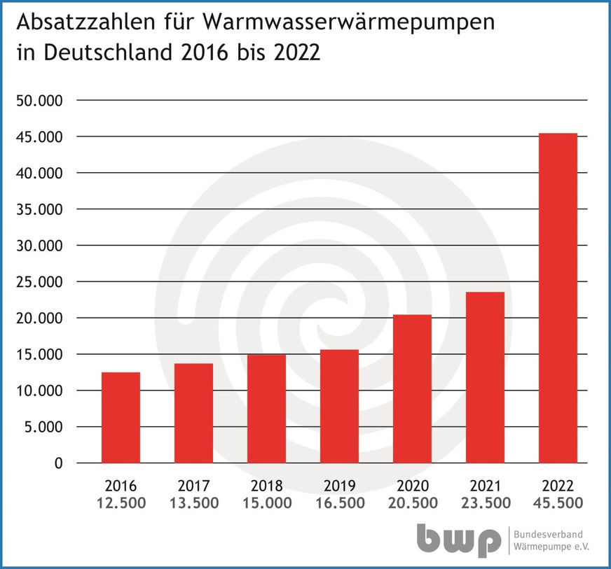 Auch die Anzahl der separat erfassten Trinkwasser-Wärmepumpen hat sich im Jahr 2022 stark erhöht: Um über 90 % auf 45 500 Geräte.