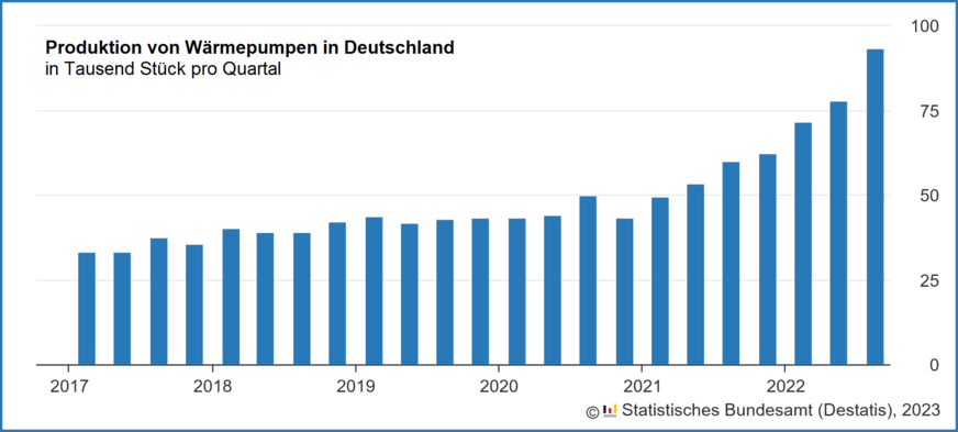 Die Produktion von Wärmepumpen in den ersten drei Quartalen 2022 ist gegenüber Vorjahreszeitraum um 49 % gestiegen. Auch der Außenhandel legte deutlich zu. Im gesamten Jahr 2022 stiegen die Importe wertmäßig um 26,5 % und die Exporte wertmäßig um 35,3 %.
