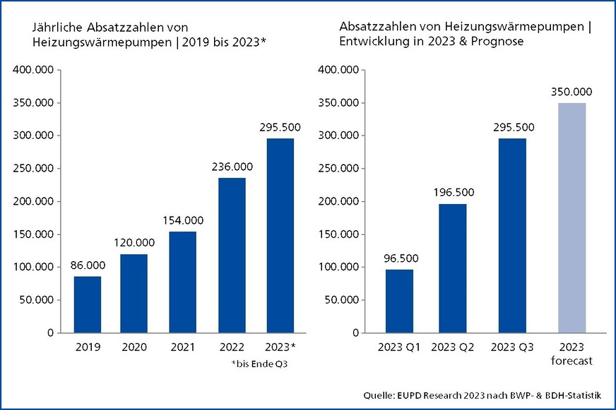 In Zeiten hoher oder steigender Energiepreise erleben erneuerbare Energien weiterhin einen Boom – dies wird auch im Wärmesektor sichtbar. So ist der Absatz von Wärmepumpen in den letzten Jahren immer weiter gestiegen. Bis Ende des 3. Quartals 2023 wurden in Deutschland bereits 295 500 Wärmepumpen verkauft („ausgeliefert“, nicht installiert). Der Absatz im Gesamtjahr 2022 von 236 000 verkauften Wärmepumpen wurde damit im Jahr 2023 bereits nach 9 Monaten deutlich übertroffen, so EUPD Research.
