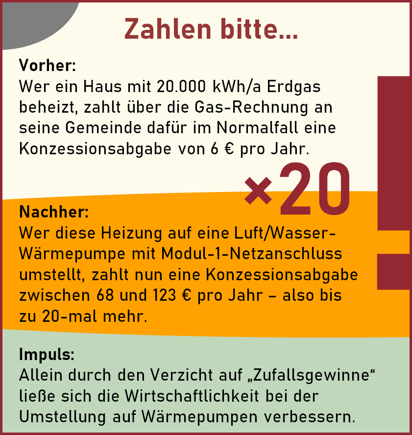 Der Heizungswende-Haushalt zahlt somit je nach Gemeindegröße eine Konzessionsabgabe für den Modul-1-Wärmepumpenstrom zwischen 67,98 und 123,09 Euro/a; inkl. 19 % Umsatzsteuer sind es zwischen 80,90 und 146,47 Euro/a – also bis zu 20-mal mehr als zuvor mit der Gas-Heizung.