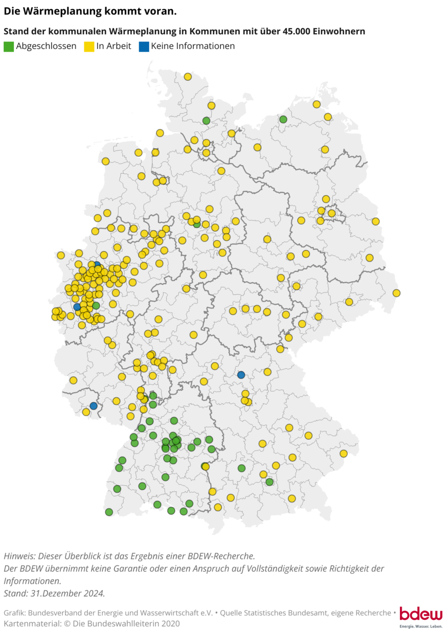 Die Analyse des BDEW zeigt, dass nahezu alle Kommunen (98 %) mit mehr als 45.000 Einwohnern bereits mit der Wärmeplanung begonnen oder diese bereits abgeschlossen haben. Gemeindegebiete mit mehr als 100.000 Einwohnern müssen bis zum 30. Juni 2026 einen Wärmeplan erstellen, alle Gemeindegebiete mit weniger Einwohnern haben hierfür bis zum 30. Juni 2028 Zeit.