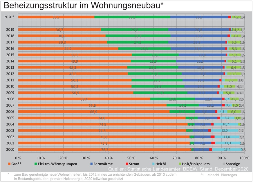 Erdgas war lange Zeit mit sehr deutlichem Abstand Spitzenreiter bei den primären Energieträgern bzw. Heizsystemen neu genehmigter Wohnungen. Im Jahr 2000 war Erdgas bei den Baugenehmigungen von Wohnungen mit einem Anteil von 76,7 % die erste Wahl. Bis Ende 2020 hat sich der Anteil wohl auf 33,7 % mehr als halbiert und die Wärmepumpe ihren Abstand zu Erdgas auf 0,2 Prozentpunkte verringert, Ende 2019 waren es noch fast 7 Prozentpunkte.