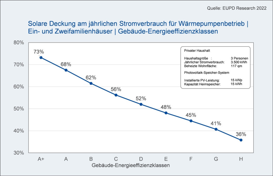 Die Installation einer Wärmepumpe-Photovoltaik-Kombination inklusive Stromspeicher kann dazu beitragen, diesen Strombedarf anteilig mit eigenerzeugtem Solarstrom zu decken. Bei einer Kombination der Wärmepumpe mit 15-kWp-Photovoltaik-Leistung und einem 15-kWh-Heimspeicher lassen sich je nach Energieeffizienzklasse des Gebäudes zwischen 36 und 73 % des Strombedarfs über die eigene Photovoltaik-Anlage decken.