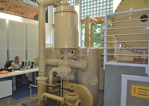 Ein ehemaliges Wasserwerk in Bonn-Plittersdorf ist heute der Sitz des Photovoltaik-Unternehmens SolarWorld AG. Ein optisch immer noch erkennbares Wasserwerk: Konzernchef Frank Asbeck bestand beim Umbau auf den weitgehenden Erhalt der vorhandenen Installationen. Um auch hier die Nachhaltigkeit als Gebot der Stunde und Wesen seiner Produkte zu unterstreichen. In der Konsequenz kam für ihn deshalb als Hauptheizung nur eine Wärmepumpenanlage infrage. Und zwar Maschinen von Waterkotte, weil Asbeck sein Privathaus ebenfalls mit der Marke Waterkotte zur Zufriedenheit temperiert. Die Wärmepumpenkaskade im ehemaligen Wasserwerk besteht aus zweimal zwei Maschinen des Typs DS in Tandem-Ausführung mit einer Heizleistung von insgesamt 240 kW, als Energiequelle wird Grundwasser genutzt. Die Wärmepumpen werden im Wechsel auf Speicher für ein hohes und ein niedriges Temperaturniveau geschaltet. Hintergrund: Im Neubaubereich, einer Aufstockung auf den Altbau und ein zum Büro umgestalteter Verdüsungsturm sah das Planungsbüro PBS & Partner, Erkrath, ein reines Niedertemperatursystem bestehend aus Fußbodenheizung, Deckenstrahlplatten und Betonkernaktivierung vor. Für die Altbauten hatte der Denkmalschutz Wärmedämmmaßnahmen verboten. Im Bestand blieb deshalb der Hochtemperaturkreis für die gusseisernen Heizkörper, zum Teil ergänzt mit Wand- und Deckenstrahlheizungen.