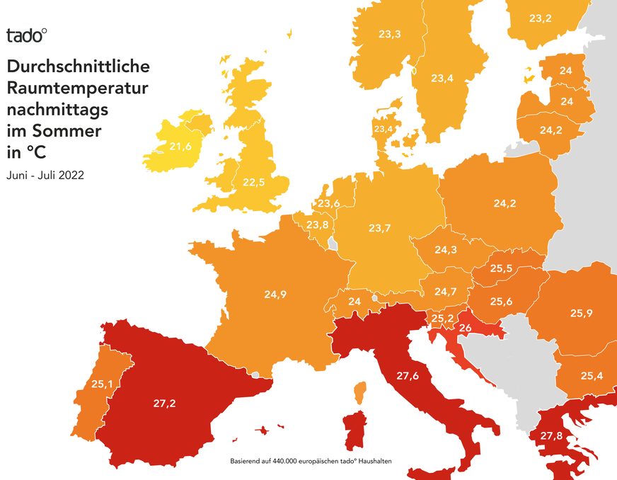 Die Studie hat tado° mit Daten aus 440 000 europäischen Haushalten für die Monate Juni und Juli in den Jahren 2020 bis 2022 zwischen 12:00 und 18:00 Uhr durchgeführt. In Deutschland lag im Juni und Juli 2022 die durchschnittliche Innenraumtemperatur bei 23,7 °C, während 2020 noch 22,9 °C festgestellt wurden.