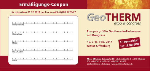 Zu den Fachbesuchern der GeoTherm zählen Ingenieure, TGA-Planer, Handwerker, Bauträger, Geologen, Brunnenbauer, Geothermie- und Bohrindustrie, Kommunen und Verwaltungen, Energieversorger, Betreiber, Investoren, Wissenschaft und Forschung. Das 1-Tages-Ticket kostet regulär 42 Euro (Frühbucher bis 27. Januar 2017: 35 Euro), das 2-Tages-Ticket kostet 62 Euro (Frühbucher: 55 Euro). TGA-Leser erhalten mit dem nachstehenden Coupon bis zum 1. Februar 2017 eine Tageskarte für 18 Euro.