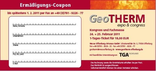 Die Geotherm ist täglich von 10.00 bis 17.30 Uhr geöffnet. An der Tageskasse kostet das 1-Tages-Ticket für den Kongress und die Fachmesse 38,00 Euro, das 2-Tages-Ticket 58,00 Euro. Frühbucher bis zum 31. Januar 2011 erhalten 10,00 Euro Nachlass. TGA-Leser zahlen unter Verwendung des unten abgebildeten Ermäßigungs-Coupons für das 1-Tages-Ticket (für Kongress und Fachmesse) bis zum 1. Februar 2011 nur 18,00 Euro. Jochen Vorländer