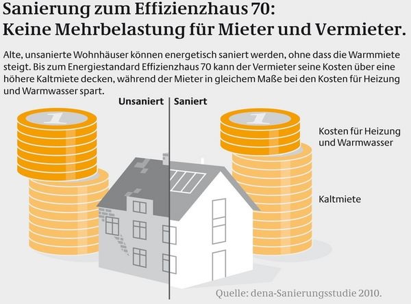 Die dena-Studie untersucht die Wirtschaftlichkeit verschiedener Sanierungsstandards. Es wurden stark sanierungsbedürftige Häuser untersucht, von Vorkriegsbauten bis hin zum 1970er-Jahre-Wohnblock. Das Ergebnis: Wenn diese Häuser so saniert werden, dass sie den aktuellen Neubaustandard Effizienzhaus 100 erreichen – das entspricht einer Energieeinsparung von rund 60 % – kostet der zusätzliche Aufwand für Energieeffizienz nur 80 Euro/m 2 . Bei der deutlich besseren Sanierung zum Effizienzhaus 70, beziehungsweise einer Einsparung von durchschnittlich 75 %, steigt dieser Wert auf 158 Euro/m 2 . Bis zu diesem Standard kann der Vermieter seine Kosten decken, ohne den Mieter stärker zu belasten. Er muss zwar die Kaltmiete um 0,82 Euro/(m 2 Monat) erhöhen, dem stehen aber Energiekosteneinsparungen von 0,92 Euro/(m 2 Monat) gegenüber.