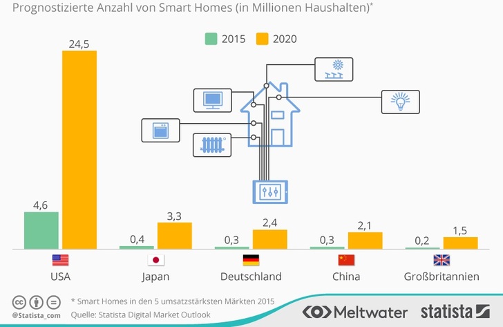 - die Penetrationsrate liegt 2016 bei 1,21 % und erreicht im Jahr 2020 voraussichtlich 6,23 % (deutlich weiter ist die Heimvernetzung beispielsweise in den USA, wo dem DMO zufolge bis 2020 rund 18,6 % aller Haushalte Smart Homes sein werden, aktuell liegt die Penetrationsrate in den USA bei 5,82 %)