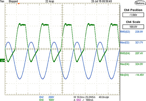 Zum Vergleich zeigt Abb. 5 die gleiche Spannung bei einem Inverter mit aktiver PFC als Boost-Konverter. Hierbei ist das Spannungspotenzial immer größer 0 V. Der minimale Wert liegt bei U min = U ZWK – 2 U ac,rms .