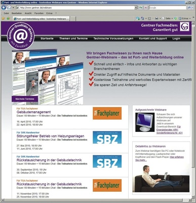Der Gentner Verlag bietet unter Federführung seiner Fachzeitschriften Gebäude-Energieberater, SBZ und TGA Fachplaner seit 2010 kostenlose Webinare zur professionellen Online-Fortbildung zusammen mit den Industriepartnern Honeywell und Grundfos an. Gestartet ist das Angebot mit einem Webinar zur KfW-Sonderförderung 431 („Heizungsoptimierung“). Über 1000 Teilnehmer informierten sich auf den ersten sechs Veranstaltungen und haben die Möglichkeit, Fragen per Chat zu stellen, sehr rege wahrgenommen.