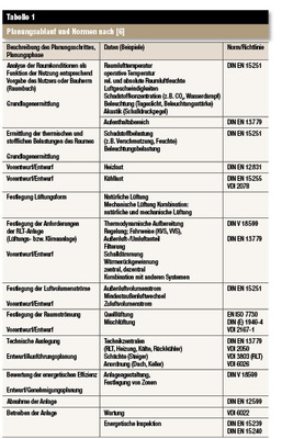 Während DIN 1946-2 für den Planer gut überschaubar war, ist die Umsetzung der genannten Richtlinien im Planungsprozess unübersichtlich und kompliziert. Eine Beschreibung, wie die Normen für eine RLT-Planung kreuz und quer verzahnt sind, zeigt Tabelle 1. Deshalb ist es sehr zu begrüßen, dass durch den Fachbereich Raumlufttechnik der VDI-Gesellschaft TGA zur Fortsetzung der Unterteilung der Lüftungsregeln nach Nutzungsbedingungen mit VDI 3804 [7] ein Entwurf (22 Seiten) für RLT-Anlagen für Bürogebäude erarbeitet worden ist. Um den Entwurf in eine Richtlinie mit hohem Nutzwert für TGA-Planer fortzuführen, werden nachfolgend einige Anregungen gegeben.