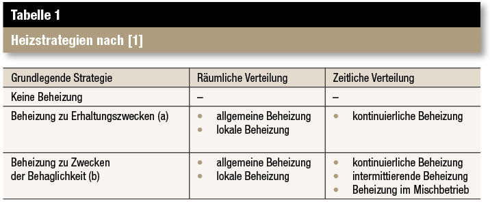 Übliche Heizstrategien verdeutlicht Tabelle 1. Sie können auch komplementär sein, beispielsweise die Kombination einer intermittierenden und einer lokalen Beheizung. Im Einzelnen werden die Systeme (s.a. Tabelle 2) mit einigen Vor- und Nachteilen erläutert. Beachtenswert ist die kritische Wertung „Temperierung“ bei der Wandheizung, ihr wird nur der Einsatz zu Erhaltungszwecken zur Verringerung der Oberflächenfeuchte mit einem geringen Einfluss auf die Behaglichkeit und möglicher Erhöhung der Salzbelastung der Wände zugeordnet.