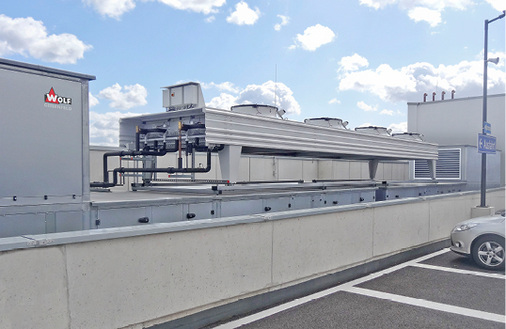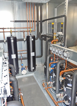 Die Lieferung der Kompletteinheiten verringerte den logistischen Aufwand, reduzierte die Schnittstellenproblematik und verkürzte die Montagezeiten erheblich. Durch die verbaute Technik konnte bei einem Großteil der Anlagen auf den Einsatz von Pumpenwarm- bzw. -kaltwasser mit aufwendiger Hydraulik und weitläufigem Versorgungsnetz, Wärme- und Kälteerzeugung und Frostsicherungsmaßnahmen verzichtet werden. Die Lüftungsgeräte werden teilweise zur Entrauchung oder zur kontrollierten Nachströmung im Entrauchungsbetrieb genutzt, das Brandschutzkonzept übertrifft die Anforderungen der Landesbauordnung. Die verbauten Wärmepumpen verfügen über bis zu acht Scroll-Verdichter zur stufenlosen Leistungsregelung von 5 bis 100 % 3 . Die Verflüssiger der Kälteeinheiten wurden integriert, teilweise befinden sich noch zusätzlich externe Kondensatoren auf den Geräten 2 .