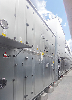Die hohen Ansprüche setzen sich in der Lüftungstechnik des Gebäudes fort. Das Gesamtkonzept wurde ausgeführt zur Zertifizierung nach DNGB-Standard in Gold und beeindruckt allein mit seinen Leistungsdaten: Insgesamt 18 wetterfeste Lüftungsgeräte (2000 bis 80 000 m 3 /h) der Marke Wolf Geisenfeld 4 fördern im Auslegungsbetrieb ca. 1,03 Mio. m³/h Luft. Ihre Rotations-Wärmeübertrager und Hochleistungskreislaufverbundsysteme erreichen im Winter eine Verminderung der Heizleistung von 3,65 MW und senken im Sommerbetrieb den Kühlleistungsbedarf um rund 1,3 MW. Die adiabatische Befeuchtung der Abluft liefert eine Kälteleistung von ca. 800 kW. In die gelieferten Systemeinheiten wurden die Kältetechnik mit Wärmepumpenfunktion (Heizleistungen von 45 bis 203 kW, Kühlleistung von 65 bis 251 kW), die adiabatische Kühlung, die WRG-Einheiten und die bedarfsoptimierte Regelung vollständig integriert.