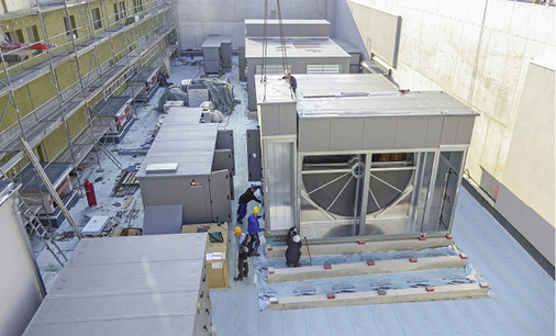 Das Gesamtprojekt stellte besondere Herausforderungen an die Logistik, da auf dieser Großbaustelle nur sehr enge Zeitfenster für Anlieferung, Transport und Montage der 38 RLT-Geräte mit einer Zuluftleistung von insgesamt rund 500 000 m 3 /h zur Verfügung stand. Dank der selbsttragenden und eigenstabilen Gerätekonstruktion, welche einen Krantransport von großen Bauteilen über demontierbare Kranösen ermöglicht, konnte die Entladung, Positionierung und Montage in Rekordzeit erfolgen Abb. 2 Abb. 3. Im Hinblick auf die einzusetzende RLT-Gerätetechnik und -Ausführung galt es, spezielle Anforderungen zu beachten. Insbesondere waren die niedrigen Schallgrenzwerte bei sehr begrenzter Aufstellfläche und beschränkter Anlagenhöhe eine große Herausforderung. Da bei diesem Projekt ausschließlich RLT-Geräte für die Außenaufstellung zum Einsatz kamen, wurden die bauseitigen Vorgaben durch den Einsatz der Premiumgeräte der Geräteserie WK-com N/S-W, in dreischaliger Bauweise, mit 80/110 mm Wandstärke gelöst. Die geometrisch flexible, selbsttragende und eigenstabile Gerätekonstruktion konnte den baulichen Vorgaben optimal angepasst werden. Notwendige bauseitige Fundamente und Tragkonstruktionen wurden auf ein Minimum reduziert oder konnten komplett entfallen.