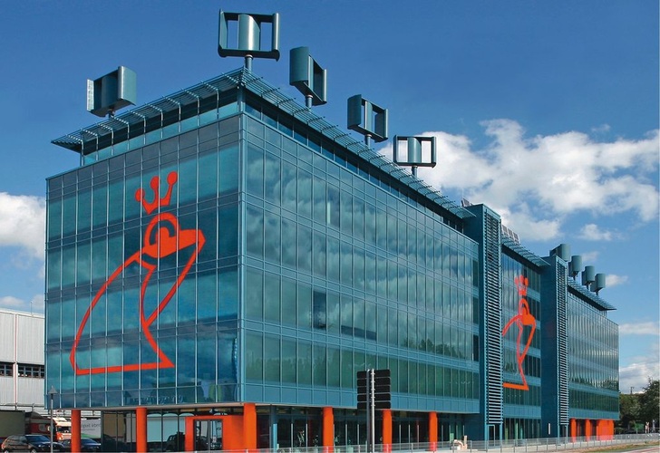 Das Familienunternehmen Werner & Mertz, bekannt durch die Marken Frosch, Erdal und tana, hat in Mainz seine neue Hauptverwaltung mit einem bisher einmaligen Energiekonzept errichtet: Mittels Windkraft, Photovoltaik und durch die Nutzung oberflächennaher Geothermie erzeugt der Neubau mehr Energie, als er im laufenden Betrieb für Heizung und die passive Kühlung benötigt. 16 Windkraftanlagen auf dem Dach nutzen die günstige Windsituation in Rheinnähe, um rund 132 MWh/a Strom zu erzeugen. Zusätzlich erntet eine 350 m 2 große Photovoltaikanlage etwa 45 MWh/a. Die Wärmepumpenanlage hat einen Strombedarf von ca. 156 MWh/a, sodass ein Überschuss von 21 MWh/a erwartet wird. In dem Plus-Energiebilanz-Haus werden die thermischen Lasten über ein in die Fußböden integriertes Heiz/Kühlsystem abgeführt. Als Wärmequelle und -senke wird Grundwasser in einer Tiefe von 5 m mit einer Temperatur von etwa 12 °C genutzt. Ein katalytisch reinigender Teppichboden im gesamten Haus wandelt gesundheitsschädliche Stoffe oder unangenehme Gerüche in der Raumluft in unkritische Bestandteile um.