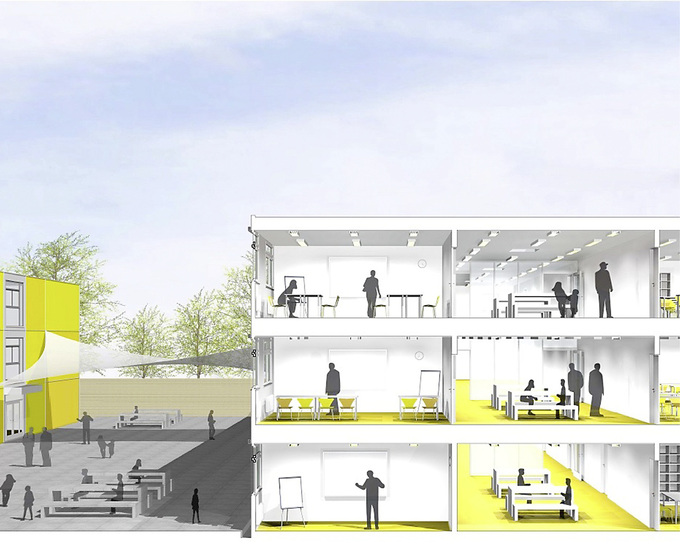 Die 8000 m 2 Fläche der Schule verteilen sich auf drei Gebäude mit jeweils drei Stockwerken. Zwischen den Baukörpern sind Pausenhöfe angelegt, die von Stoffsegeln überspannt werden. Die Geschosse werden durch innenliegende Treppenhäuser erschlossen. Die Räume sind unterschiedlich groß – zwischen 17 und 87 m 2 sind viele Varian-ten möglich. Die 6 m breiten Flure, die auch als Pausenhallen genutzt werden können, sowie 6 m tiefe Nutzraumzonen unterstreichen die großzügige Raumgestaltung. Komplettiert wird das Raumpro-gramm durch Sanitärräume für die Schüler, Behinderten-WCs, Sanitärräume für das Lehrpersonal sowie Speise- und Technikräume. https://www.renz-container.com/