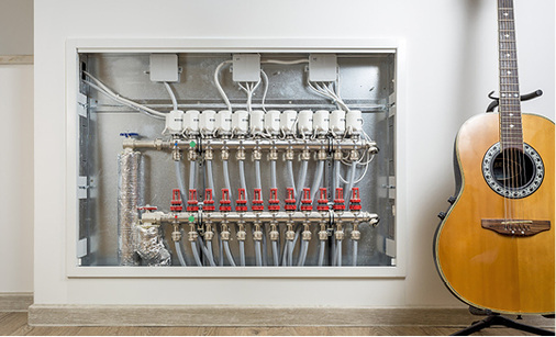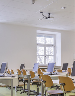 Bei der Sanierung des Herrenhauses von St. Josef stand für den Estrich lediglich eine Aufbauhöhe von 30 mm zur Verfügung. Die in diesem Fall für insgesamt 140 m 2 Fußboden favorisierte Lösung – eine 10 mm dicke Norit-Holzweichfaserplatte zur Schallabsorption und Norit-TE-20-Trockenestrichelemente – hält diese Vorgabe ein. Bei der Fachakademie, wo eine Fläche von 170 m 2 bearbeitet wurde, besteht der Systemaufbau über der Holzbalkendecke aus einer Splitfüllung, ebenfalls einer 10 mm dicken Norit-Holzweichfaserplatte und der Fußbodenheizung Norit-TE 30 Therm GF.