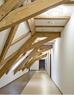 Bei Decken und Fußböden forderte die Statik ihren Tribut. Im „alten Klosterviereck“ mussten die Holzbalkendecken durch eine bewehrte Holz-Beton-Verbundkonstruktion ertüchtigt werden, bevor mit dem Aufbau des Fußbodens begonnen werden konnte. Für die Bereiche mit Gewölbedecken und sichtbarem Gebälk lautete das Motto „so trocken wie möglich“. So entschied sich der Architekt durchgängig für die mit dem BVF-Gütesiegel ausgezeichneten Trockenestrichsysteme von Lindner GFT.