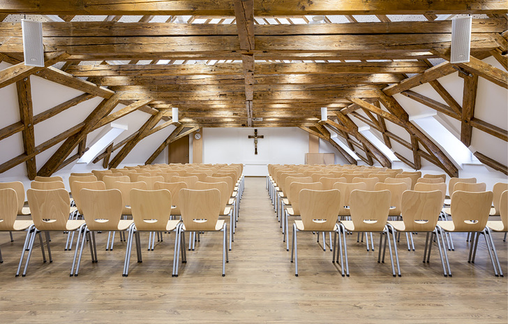 Beide Einrichtungen sind in Gebäuden mit zum Teil besonders erhaltenswerter Bausubstanz untergebracht. Dies gilt vor allem für das Realschulgebäude, das zum denkmalgeschützten „alten Klosterviereck“ zählt und im Kern bis ins 17. und 18. Jahrhundert zurückreicht. Sowohl die Räumlichkeiten der Realschule als auch die der Fachakademie wurden kürzlich saniert und an heutige Anforderungen angepasst. Dies ging nur mit einem planerischen Konzept, das denkmalpflegerische Aspekte, aktuelle Vorgaben zum Brand-, Wärme- und Schallschutz und eine moderne Nutzung in Einklang brachte. Entwickelt hat es der unter anderem auf Schulbauten spezialisierte, vor Ort ansässige Architekt Norbert Hecht. Hecht machte aus der Not eine Tugend und bezog die historische Bausubstanz als gestalterisches Element mit ein. Zum Beispiel ließ er das Gebälk im zuvor weitgehend ungenutzten Dachgeschoss der Realschule freilegen. Das durch Bürsten von Farbe und Verwitterung befreite Holz schmückt nun die auf einer Nettogrundfläche von 720 m 2 neu eingerichteten sieben Projekt- und Mehrzweckräume. Das Gleiche passierte bei den ehemaligen Gefängniszellen von St. Josef, die nach ihrem Umbau als Wohnheim für die Schülerinnen und angehenden Erzieherinnen dienen.
