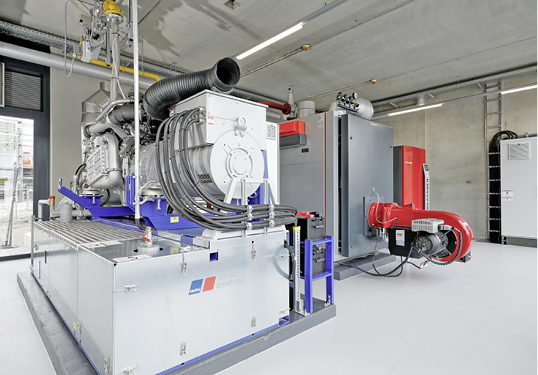Die Green Factory 2.0 kann nahezu energieautark betrieben werden. Eine rund 10 000 m 2 große Photovoltaik-Anlage (1,1 MW p ) versorgt die grüne Fabrik mit 90 % der benötigten Energie für Strom, Kälte, Wärme und Druckluft. 10 % deckt ein BHKW Abb. 2 ab. Integriert in das Energiekonzept ist auch ein 200-kW-Pellet-Heizkessel. Herzstück der Green Factory 2.0 ist eine Energiezentrale Abb. 3, das Energiemanagementsystem kommt von E-Con. Und das gesamte Gewerbegebiet Ungerhausen profitiert vom Konzept der Green Factory: Überschüssige Kälte- und Wärmeenergie geht in ein gemeinsames Netz, so werden benachbarte Firmen gleich mitversorgt. Bei der TGA setzt die Green Factory 2.0 voll auf digitale Wartung und Instandhaltung. Sämtliche Anlagen sind dazu mit intelligenten Sensoren ausgestattet. Durch die Vernetzung der gesamten Anlagentechnik können Störungen zentral behoben, sämtliche Parameter verändert und Wartungsabläufe vollautomatisch gestartet werden.