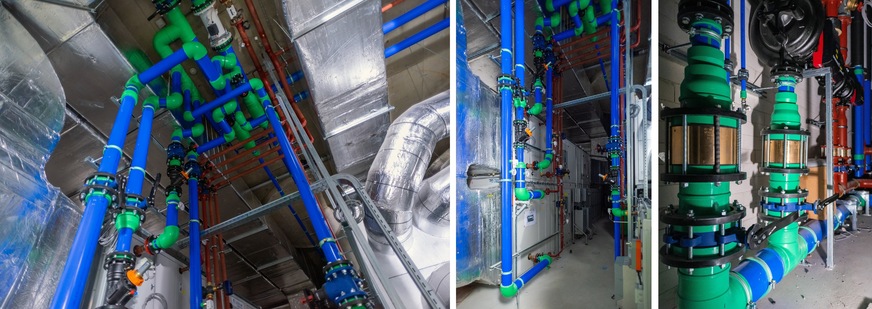 Für die gesamte Kälteverrohrung setzten die Planer aquatherm blue pipe aus dem Kunststoff Polypropylen (PP-R) ein. Polypropylen – ein Beiprodukt der Rohölverarbeitung – ist einer der beiden wichtigsten Standardkunststoffe. Durch Lebenszyklusanalysen nach ISO 14040 werden die Auswirkungen der Rohstoffherstellung auf die Umwelt untersucht. Studien weisen dabei deutlich geringere CO2-Emissionen für Polypropylen-Rohre im Vergleich zu anderen Rohmaterialien, speziell Stahl, aus.