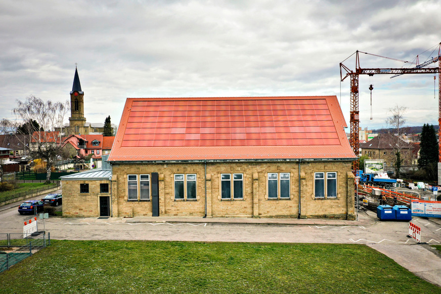 Damit Gebäude auch unauffällig Solarstrom produzieren können – zum Beispiel denkmalgeschützte Bauten – braucht es in Gebäudehüllen integrierbare Photovoltaik-Module in angepassten Farben. Im Rahmen des Forschungsprojekts PVHide haben das Fraunhofer-Institut für Solare Energiesysteme ISE gemeinsam mit dem Modulhersteller AxSun Solar, der Interpane Entwicklungs- und Beratungsgesellschaft sowie der Stadt Eppingen eine ziegelrote Photovoltaik-Anlage direkt in das Dach einer Turnhalle installiert.