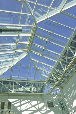 Die Verglasung besteht aus drei Scheiben mit Argon-Füllung in den Zwischenräumen. Davon verfügen zwei Scheiben über eine Low-E-Beschichtung. Den Abstandhalter bildet die „warme Kante“ mit Superspacer. Der Wärmedurchgangskoeffizient beläuft sich auf 0,70 W/(m 2 K) in der geneigten Einbaulage. Vor der Sanierung herrschten direkt unter dem Glasdach teilweise bis zu 50 °C an heißen Sommertagen. Durch die neue Konstruktion und eine unterstützende Lüftungsanlage wird gewährleistet, dass auch an den wärmsten Tagen des Jahres die Temperatur nicht über 28 °C steigt. Für die Be- und Entlüftung und den Rauchabzug im Brandfall sorgen 42 RWA-Lüfterflügel.