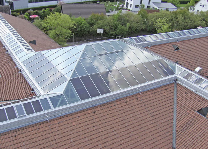 Lernen wie unter freiem Himmel – das ist in der Sebastian-Strobel-Schule in Herrieden möglich. Die Glasdachkonstruktionen über der Aula und den vier Gebäudeflügeln der Schule 1 wurden kürzlich komplett saniert und mit energieeffizienter Tageslicht-Technik ausgestattet: Die passivhaustauglichen Oberlichter von Lamilux – zertifiziert als Klasse „pha advanced component“ – vereinen hohen Tageslichteinfall mit solarer Energieerzeugung durch semitransparente Dünnschicht-Module 23 . Die bereits bestehende Primärkonstruktion wurde zunächst gereinigt, lackiert und mit einem neuen Korrosionsschutz versehen. Die Stahlkonstruktion des Atriumdachs wurde komplett demontiert. Ziel war laut Architektin Christine Pfister, die Schule weiterhin hell zu belichten und die Tageslichtfarbe so natürlich wie möglich in den Innenraum zu bringen.