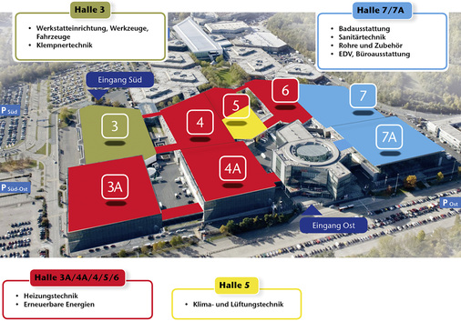In Halle 3 befinden sich Aussteller der Produktgruppen Werkstatteinrichtung, Werkzeuge, Fahrzeuge und Klempnertechnik. In den Hallen 3A und 4A sind erneuerbare Energien und Heizungstechnik mit Brennertechnik, Heizkessel, Solarthermie, Photovoltaik und Speicher zu finden. Erneuerbare Energien und Heizungstechnik mit den Schwerpunkten Wärmepumpen, Heizkessel, Biomasse, Kamin- und Kachelöfen und Schornsteintechnik gibt es in Halle 4.