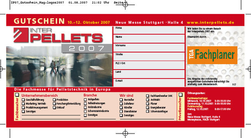 Wir laden Sie ein: Mit unserem Eintrittsgutschein zur Interpellets 2007 bleiben Sie im Thema. Die Abgabe des vollständig ausgefüllten Gutscheins berechtigt Sie zum einmaligen Messebesuch. Tipp für Einsteiger aus dem SHK-Fachhandwerk: Das Kompaktseminar „Pelletsheizungen in Deutschland“ am 10. Oktober von 10.00 bis 14.00 Uhr erleichtert den Markteinstieg.