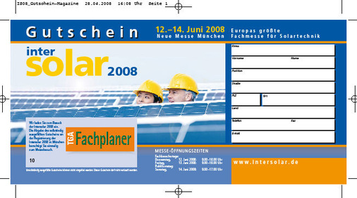 Die Solartechnikbranche wächst, und mit ihr auch die europaweit wichtigste Branchenplattform, die Intersolar. Nach dem enormen Wachstum der Messe in den vergangenen Jahren am Standort Freiburg findet die Intersolar 2008 erstmals in München statt. Hier legt die Intersolar nun nochmals kräftig zu: Auf einer mit 76000 m² fast verdoppelten Fläche werden sich über 1000 (2007: 642) internationale Aussteller der Solarbranche präsentieren. Rund 40000 Besucher erwarten die Veranstalter – ein Plus von 25 % gegenüber dem Vorjahr.