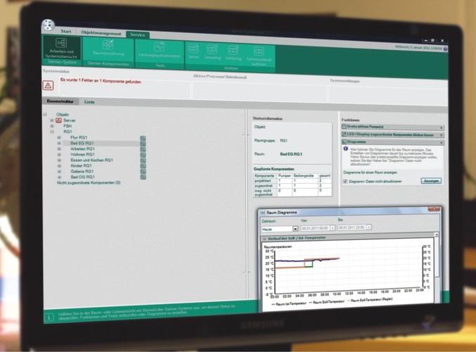 Wilo, 9.1 B/C/D46: Der Anwendungsbereich des Dezentralen Pumpensystems Wilo-Geniax wird um die Kühlung über eine Fußbodenheizung in Verbindung mit einer Wärmepumpe erweitert. Eine noch flexiblere Bedienung und Regelung, inklusive Fernaufschaltung erschließt künftig die Software SysManager.