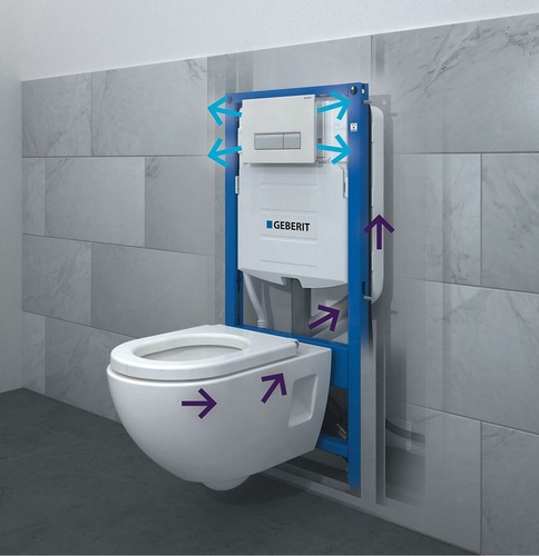 Geberit, 4.0 A/B06: Die Geruchsabsaugung DuoFresh beseitigt Gerüche. Durch einen seitlichen Lüftungskanal am Spülkasten wird Luft über das Spülrohr direkt aus der WC-Keramik abgesaugt. Mittels Aktivkohlefilter gereinigt, gelangt sie durch Öffnungen rund um die Betätigungsplatte wieder in den Raum.