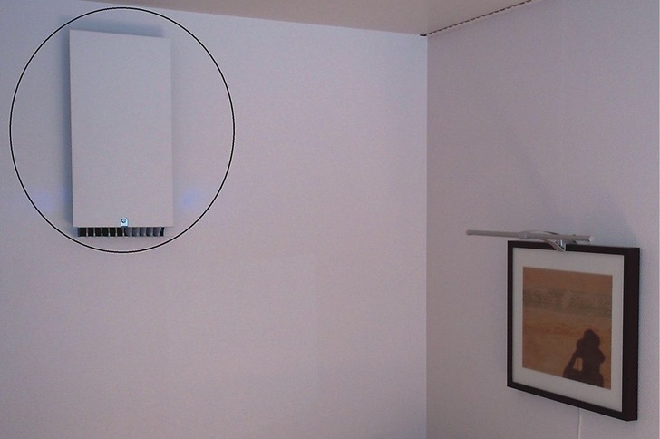 bluMartin, F11.0 B21: freeAir 100e ist ein nach den Passivhaus-Kriterien entwickeltes dezentrales Frischluft-System mit Gegenstromwärmeübertrager (Wärmerückgewinnungsgrad über 90 %). Es arbeitet mit einer Steuerung, die CO 2 , Feuchte und Temperatur misst und so einen Luftwechsel nach dem tatsächlichen Bedarf ermöglicht. Die Abdeckplatte ist kaum größer als ein DIN-A3-Blatt.